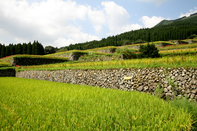 宮崎県南部、日南市の西側に広がる鰐塚山地は、年間降水量が3000メートルを超える多雨地帯であり、飫肥杉と呼ばれる良質な杉材が産出されることで知られている。そのほぼ中央に位置する酒谷地区は、酒谷川沿いや地滑りによって形成された緩斜面地に小規模な集落が点在している山村だ。日南市の最高峰にあたる小松山の南西斜面に位置する坂元集落の北側には、標高255メートルから315メートルの範囲にかけて、昭和初期に築かれた石積の棚田が広がっている。集落を取り囲む山林は営林の場であると共に水源涵養林としても機能しており、棚田に豊富な水をもたらしているなど、農業と林業に基づく地域特有の土地利用のあり方を目にすることができる。 ![]() 山林によって取り囲まれている坂元集落