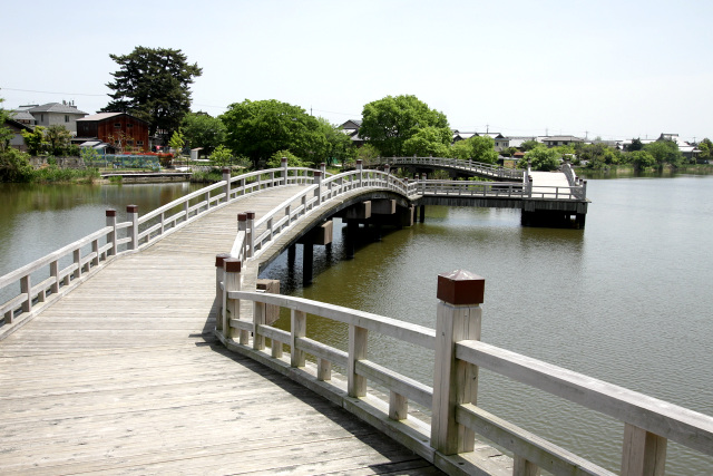 唯一現存する大溝城の建造物として貴重である 琵琶湖の東岸に安土城を築いた信長は、琵琶湖沿岸に数多くの城を築いて防御を固めた。安土城の対岸に位置する大溝港は特に重要視され、大溝城は港を守るように築かれている。縄張りの設計は築城に秀でた明智光秀が手がけたと伝わっており、内湖を天然の濠として利用した水城となっている。廃城後は武家町である三の丸以外はすべて棄却されたが、分部氏は三の丸に陣屋を築き、大溝の町は江戸時代を通じて高島郡の政治拠点として栄えていった。かつて三の丸の周囲には石垣と土塁が巡らされ、本丸へと通じる東以外の三方に門を設けて人の出入りを管理していた。中でも北の町人地に面した「総門」は三の丸の正門であったと考えられており、近年まで民家の長屋門として利用されていた。 ![]() 大溝城本丸の南に広がる内湖「乙女ヶ池(旧名は洞海)」