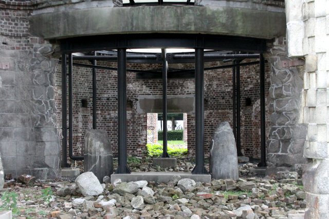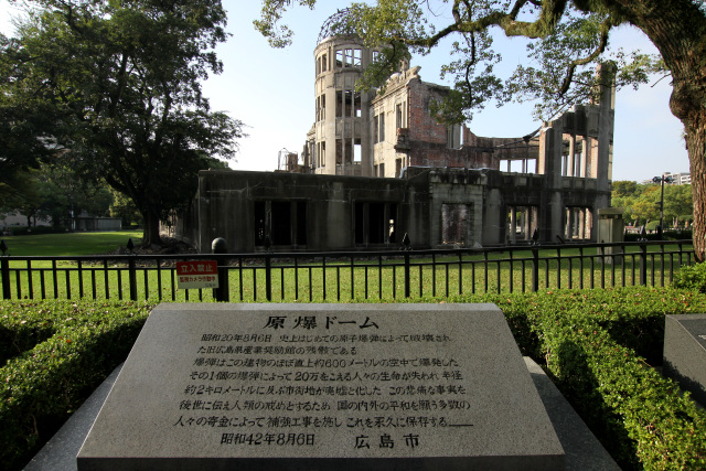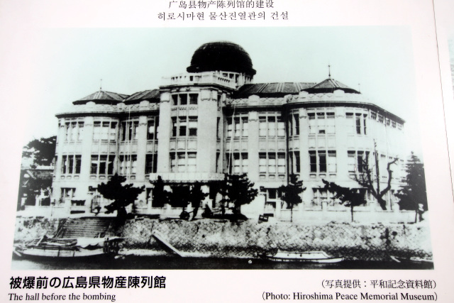 アメリカ軍による本土爆撃の激化や沖縄上陸により日本の敗色が濃厚になっていた昭和20年の8月6日、北マリアナ諸島のテニアン島を発進したB-29爆撃機「エノラ・ゲイ」は午前8時15分に広島市上空にて原爆を投下、目標としていた相生橋から約240メートル東に位置する島病院の上空約600メートルで炸裂した。原爆から発せられた爆風、熱線、放射線は爆心地から1.4キロメートル以内で人体に致命的な熱傷を与え、2キロメートル以内では大半の建物が全壊全焼。広島市の調査では同年中に約14万人が死亡したと推定されている。広島県産業奨励館も天井から火を噴いて全焼し、建物の屋根と床はすべて破壊された。壁は建物の中心部がかろうじて残ったものの、大部分は一階部分をのぞき倒壊した。 ![]() 第一回保存工事の完了に伴い設置された記念碑