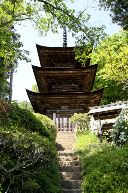 大法寺の起こりは大宝年間(701年〜704年)、藤原鎌足(ふじわらのかまたり)の長男、定恵(じょうえ)によって創建された大宝寺がその始まりであるとされる。しかしながら、定恵は665年に死去しているため、その話は定かではない。その後、平安時代の大同年間(806年〜810年)、坂上田村麻呂(さかのうえのたむらまろ)の発願によって、初代天台座主の義真(ぎしん)により再興がなされたということが、寺の記録に残っている。国宝の三重塔が建てられたのは正慶2年(1333年)。すなわち、新田義貞(にったよしさだ)軍が鎌倉に攻め込み、北条高時(ほうじょうたかとき)ら北条氏一族を滅ぼした、鎌倉幕府滅亡の年だ。それは、大正9年の解体修理で発見された墨書により判明した。 ![]() 檜皮葺屋根の反りが美しい