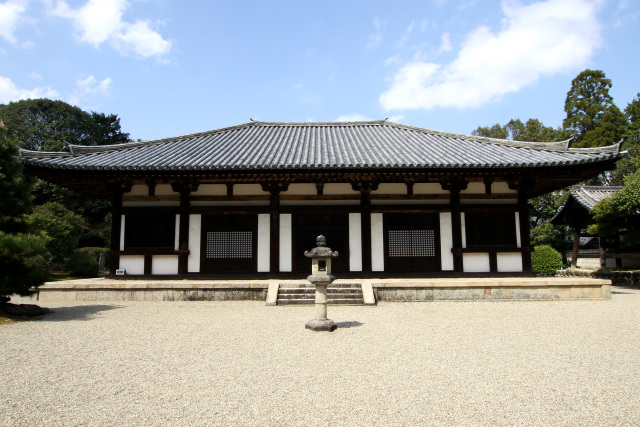 往時の秋篠寺は、官寺として必要な諸堂が全てそろった大寺院であった。南門、金堂、講堂が南から北に向けて一直線上に並び、また金堂の手前左右には東塔と西塔が対を成して屹立していた。しかし平安時代末期の保延元年(1135年)、兵火によって伽藍が焼け、講堂以外の主要建造物が全て失われてしまった。秋篠寺は唯一焼け残った講堂を本堂とし、金堂や塔などは再建されないままに存続して行く。かつての金堂と東塔の跡には、今もなお礎石が残されており、特に東塔のものは、柱を安定させる為の突起である枘が付いた見事なものである。これらの礎石からだけでも、秋篠寺が他の官寺と比べて見劣りする事の無い、立派な寺院であったことが見て取れる。 ![]() 奈良時代の建築を思わせる、秋篠寺金堂
