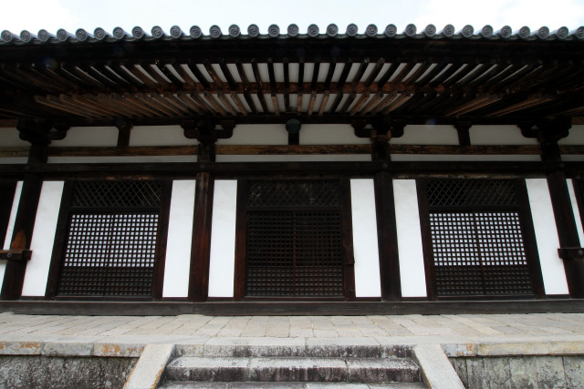 秋篠寺本堂の規模は、桁行五間に梁間四間。屋根は勾配が緩やかな一重の寄棟造であり、本瓦葺きである。大棟の端には鳥休みと呼ばれる円筒状の飾りが付けられており、その大棟の端から四隅に落ちる降棟には、頭頂部に鳥休みを付属した鬼瓦が二つずつ乗っている。軒下の垂木は二軒(ふたのき)で、飛檐垂木(ひえんだるき)も地垂木(じだるき)も角垂木である。奈良時代の二軒は地垂木が丸垂木となるのが一般的なので、これもまた古式とは異なる点である。組物は簡素な平三斗(ひらみつど)。中備(なかぞなえ)には間斗束(けんとづか)が入る。正面五間のうち、中央三間には格子戸が開かれ、両端の間には格子の並ぶ連子窓(れんじまど)が設けられている。 ![]() 軒下の組物や建具は非常にシンプルな意匠である