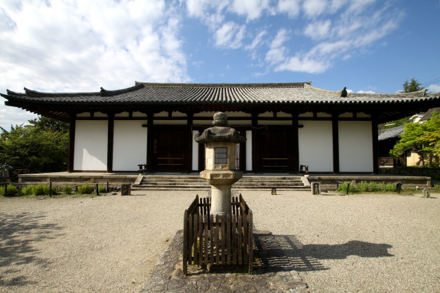 現本堂の屋根は一重の入母屋造で、本瓦葺である。屋根の傾斜が非常に緩やかだが、それは天平建築の特徴である。規模は桁行七間に梁間五間。ただし、建物の身舎(もや)自体は桁行五間に梁間三間で、その周囲に一間の庇を取り付けた構造となっている。正面中央三間と、左右、背後の中央一間に戸を設け、それ以外は全て白壁となっており窓は無い。柱の上の組物は、大斗(だいと)の上に肘木(ひじき)が乗るだけであり、その間に入る中備(なかぞえ)も間斗束(けんとづか)と簡素なものだ。全体的にシンプルな意匠となっている。垂木は二段になっている二軒(ふたのき)で、下部の地垂木(じだるき)が丸垂木になっているが、これもまた古式の特徴である。 ![]() 本堂の西側面