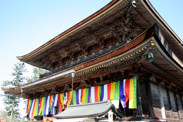 金峯山寺は、修験道の開祖である役行者(えんのぎょうじゃ)こと役小角(えんのおづぬ)によって開かれたとされる。平安時代、真言宗の僧侶である聖宝(しょうぼう)によって伽藍が整えられた事から、醍醐寺三宝院を総本山とする、修験道当山派の門徒により栄えた。当時は数多くの僧兵を抱え、その戦力は興福寺や延暦寺にも劣らない程であったという。南北朝時代突入時、後醍醐天皇は三種の神器を持ち出して吉野へと移り、南朝を興したが、その背景にはこの吉野の軍事力があったのだ。江戸時代には徳川家康の命により天台宗へと改宗。明治時代に入ると修験道廃止令が出され、一時は廃寺となるが、間もなく復興し、現在は金峯山修験本宗の総本山として信仰を集めている。 ![]() 東大寺大仏殿に次ぐ規模を持つ金峯山本堂