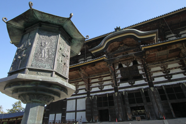 正面の唐破風下には大仏を拝顔できる観相窓が設けられている 奈良時代中期の天平年間。それは天然痘が流行し、干ばつが続いて飢餓が起き、また大地震が都を襲うなど、災厄の時代でもあった。聖武天皇は仏教を通じて国家泰平を図るべく、国分寺と国分尼寺を各国に作らせる詔(みことのり)を天平13年(741年)に発した。そうして作られた全国68ヶ所の国分寺のうち、東大寺は国分寺の総本山として創建された、大和国の国分寺である。さらに天平15年(743年)、聖武天皇は盧舎那大仏造立の詔を発し、その造立は天平19年(747年)より始められた。それは日本史上最大の国家事業として数多くの優秀な技術者のもと、膨大なる費用と時間をかけて進められていった。鋳造が全て完了したのは、天平勝宝元年(749年)の事であるという。 ![]() 大仏殿の前には創建当初より残る金銅八角灯篭(国宝)が据えられている