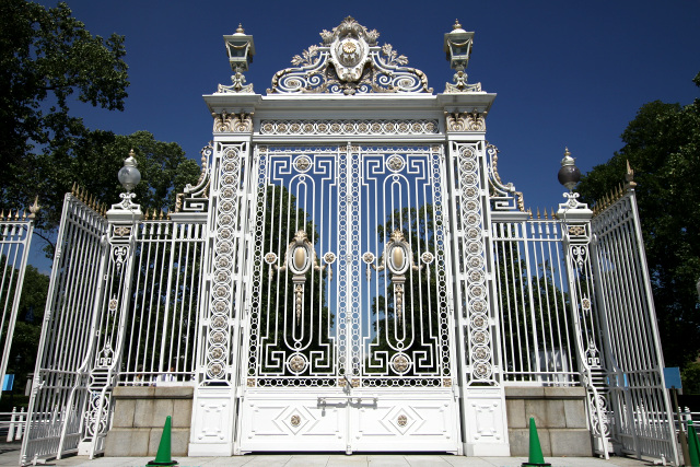 正面玄関から入ると階段があり、それを上った突き当たりが「朝日の間」である。その名の通り、天井に朝日を背に受けた女神の絵が描かれている。階段ホールを挟んだ向かい側の「彩鸞の間」には、鸞の石膏レリーフが飾られている。その内装は金箔がふんだんに用いられており、極めた絢爛豪華だ。反面、東棟にある「花鳥の間」は、茶色を基調としたシックな内装であり、花と鳥をあしらった七宝焼が飾られている。西棟にある「羽衣の間」は舞踏室で、オーケストラボックスが存在する。その天井絵は、能の謡曲「羽衣」の一説をモチーフとして、フランス人画家が描いたものだ。北東端の部屋はアラビアの情緒漂うムーリッシュ様式の「東の間」で、窓にはステンドグラスが用いられている。 ![]() 附けたり国宝の旧東宮御所正門