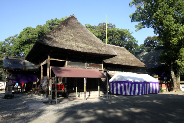 熊本県南部、激流として知られる球磨川(くまがわ)中流域に広がる人吉盆地は、日向、薩摩、佐敷(現在の熊本県芦北町)を結ぶ交通の要衝、球磨地方の中心地として機能してきた。人吉盆地の西部に鎮座する阿蘇青井神社は、古くより開拓・農業の神として信仰を集めた古社である。境内に連なる茅葺と銅板葺の社殿は、江戸時代初頭にまとめて造成されたもので、統一感のあるたたずまいを見せる。建築としての完成度も高く、中世からの流れを汲みつつ桃山様式の装飾を採り入れている。それらの社殿は球磨地方を代表するものであり、また広く南九州一帯にも影響を与えたことから、境内の中核を成す「本殿」「廊(ろう)」「幣殿」「拝殿」「楼門」の5棟が国宝に指定されている。 ![]() 大きな茅葺屋根が印象的な拝殿は、慶長16年(1611年)に建てられた