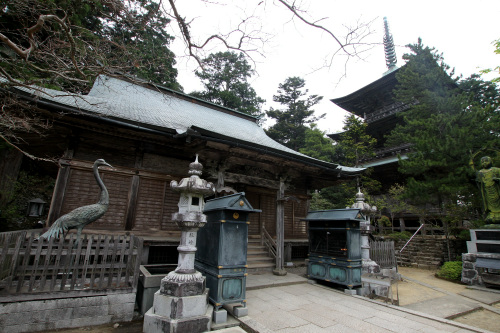 登山とはいえど、鶴林寺道の距離は2km足らず。いちおう焼山寺と同じく「へんろころがし」と称されているようだが、丸一日かけての山登りだった焼山寺と比較すると楽なものだ。古い丁石を眺めたり、石畳の風情を楽しみながら登ること約一時間、鶴林寺の山門に到着した。 ![]() 山門の左右には、仁王像と共に一対の鶴が祀られている
