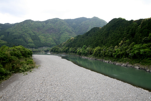 右奥に見えるのが、太龍寺が鎮座する太竜寺山である 事前に地図で見て知っていたことではあるが、次の太龍寺もまた山の上である。霊場は修行の場なのだから険しい場所にあるのは当然といえば当然なのだが、こうも立派な山容を見せつけられると、もう少し楽な場所に寺院を建てても良かったのではないかと先人に言いたくなる。 ……まぁ、愚痴っていても始まらない。むしろ山間部は昔ながらの遍路道が残っている確率が高いエリア。古いモノ好きとしては望むところである。さぁ、気張って登るとしようではないか。 ![]() 四国一水質の良い川として知られる那賀川を渡り――