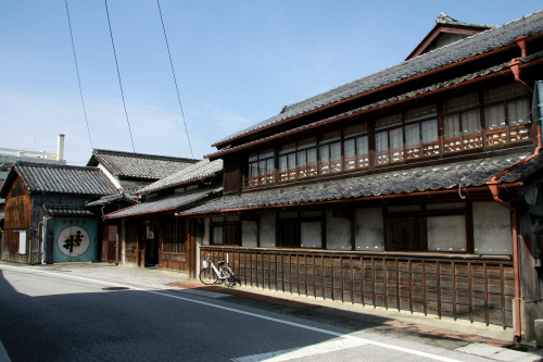 二十三士の墓がある福田寺から入り組んだ路地を進んでいくと、たいそう立派な門構えの屋敷が姿を現した。田野一の豪商であった「岡家住宅」とのことで、地元では「岡御殿」と呼ばれているらしい。参勤交代や東部巡視などの際に本陣として藩主が宿泊していた家らしく、現存するものは幕末の天保十五年(1844年)に建てられたという。 まるで城郭の御殿のような立派なお屋敷である。一般公開もしているようなのでぜひとも拝観してみたいと思ったが、オープンは9時とのこと。現在時刻は6時半と待つにはいささか早すぎるので、残念だが先へと進むことにする。 ![]() 川沿いには立派な土蔵を持つ酒蔵があった
