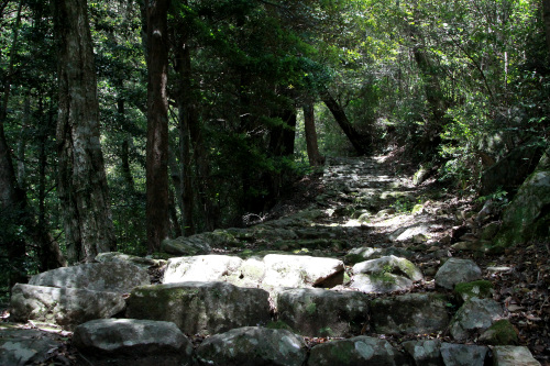 とりあえず本堂と大師堂でお参りを済ませ、社務所で納経をする。だが、それだけで神峯寺を後にするのも味気ないというものだ。この神峯寺はあくまで明治時代に再興された新しい寺院である。それ以前より遍路の崇高を集めてきた霊場としての歴史は、さらに石段を上った先に鎮座する神峯神社の方が圧倒的に長いのだ。 ![]() というわけで、境内のさらに奥へと伸びる石段を進んでいく
