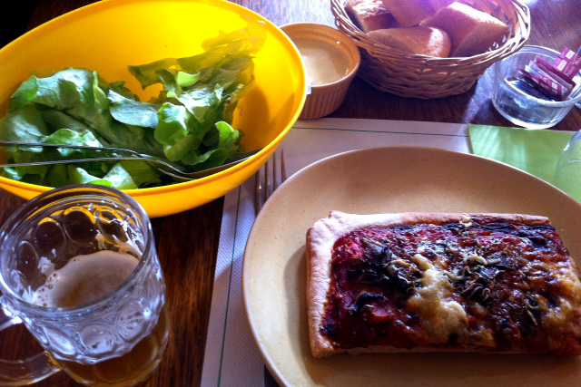 しかし、ジットはユースホステルよりも多少安く泊まることができる。……はずなのだが、看板を頼りにたどり着いたサン・プリヴァ・ダリエのジットは素泊まりが無く、朝食付きで20ユーロとユースホステル並みであった。その分、建物は綺麗でフリーWifiも飛んでいるし非常に快適なのだが、これから毎日がこんな調子だったら財政難に陥りそうだなぁ。そんな思いが頭をよぎった。 ![]() 夕食は村のカフェでいただいた