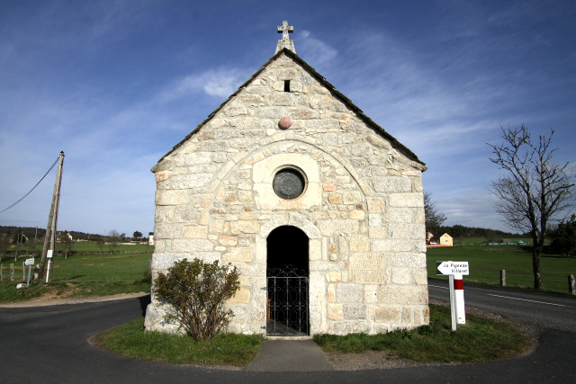 朝という事もあり、村は静まり返っていた。聞こえる音も、玄関の前を掃除していたおばさんのホウキくらいなものである。そのおばさんの家の門には、キノコを象った彫像が飾られていた。巡礼路序盤、このオーブラック周辺では同じようなキノコの像を何度か見かけたので、おそらくキノコがこの地方の特産品なのだと思う。 舗装道路をてくてく歩いて行くと、道の向こうに礼拝堂が見えた。車道と車道が合流するT字路の真ん中にポツンと建っている。小ぢんまりとした礼拝堂ではあるが、なかなかかわいらしい。 ![]() 交差点の中に建つ小さな礼拝堂
