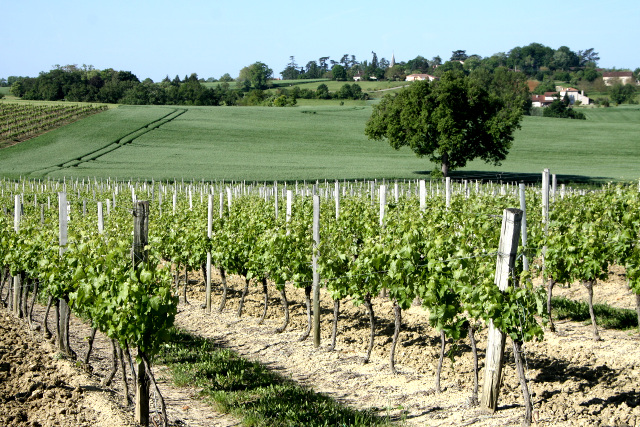 かつては近くに修道院もあったというこのアルティグ橋(Pont d'Artigue)は、中世から現在にまで残るサンティアゴ巡礼の証左として世界遺産「フランスのサンティアゴ・デ・コンポステーラの巡礼路」の構成要素となっている。不規則な4連のアーチからは地形に合うように橋を架けたという工夫が感じられ、なかなか興味深い。 今日も巡礼路は相変わらずの麦畑であるが、この辺りはアルマニャックの産地という事もあってか、ブドウ畑も多く見られた。いずれも壮観である。 ![]() ブドウ畑の奥には青々とした麦畑が