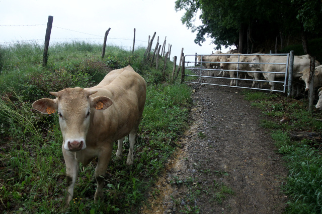 しばらく一人で歩いて行くと、ルヴィニー(Louvigny)という村に到着した。ここに来て雨がさらに強くなり、歩くのが少々辛くなってきたので雨宿りができる場所を探す。村の中心にある屋根付きのバス停には、ジャン&ジーナさんの姿があった。彼らもまたこの村で雨宿りをしていくようである。私もそのバス停にお邪魔しようかと思ったが、なんとなく遠慮してその少し先に建っていた教会で雨宿りをする事にした。 雨脚が若干弱まったようなので教会からのっそり出てみると、ちょうどジャンさん達も出発する所であった。私が彼らを避けて休憩していたと彼らの目には写ったのだろう、ジャンさんはやや悲しそうな、そして若干の非難を込めた感じの口調で「Join me」と言った。いやはや、返す言葉もありません。私は改めて、自分が精神的な引きこもり体質なのだなぁと実感した。どうも、なかなか人の懐に飛び込んで行く事ができないのだ。まったく、困ったものである。 ![]() 巡礼路は牧場の中を突っ切る