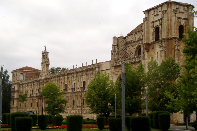 しばらく日本人同士で話が弾み、私が宿を出たのは7時半頃であった。どんよりとした曇り空の下、カテドラルを横目にレオンの町を北西へと抜ける。旧市街の出口にあたる場所には、かつて救護院として巡礼者に一夜の宿を貸していたというサン・マルコス修道院が鎮座していた。 現存するサン・マルコス修道院は、16世紀にプラテレスコ様式(スペイン風ルネサンス様式)で再建されたあまりに壮大な建物で、昨日見学したレオン大聖堂やサン・イシドロ教会と共に、レオンを代表する歴史的建造物として知られている。 ![]() おびただしい数のホタテ貝で飾られているファサード