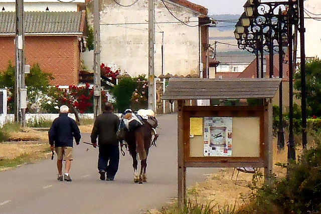 出発から一時間強、8時半に私は次の町オスピタル・デ・オルビゴ(Hospital de Orbigo)に到着した。その入口には、馬を引き連れて歩く二人組の巡礼者の姿があった。昨日サン・マルティンの私営アルベルゲ前に繋がれていたあの馬である。 ![]() 乗るのではなく、荷物の運搬用らしい