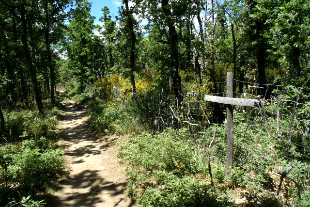 巡礼路はアップダウンを繰り返しながら徐々に高度を上げて行き、周囲には木々が多くなってきた。基本的には車道沿いの未舗装路で、時々アスファルトに降りる感じの道である。車道を通る車はほとんど無く、もはや自転車巡礼者の専用道路と化している。 ![]() すっかり山道らしくなってきた