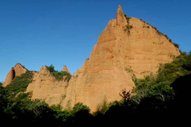 「山崩し」に使われた大量の水は、このような水路を用いて最大で80km程も離れた複数の水源から引いていたそうだ。現在は岩をくりぬいて水路にした部分が残るのみだが、かつてはこれが山向こうまで延々と続いていたのだろう。 ふと時計を見ると、既に正午過ぎである。そろそろ昼食にしたいなと思いながら歩いていると、水路跡の少し先でベンチ付きの休憩所を発見した。こりゃちょうど良いやとそのベンチに腰掛けフランスパンを食べる……が、口に入れたパンを飲み込もうとペットボトルに目をやると、水がもう残り僅かではないか。というか、あと一飲みで終わりである。この暑さで水無しになってしまうとは、ちょっとやばそうだ。ラス・メドゥラスには飲み物を売っている売店が一切無いのである。 地図とにらめっこしながら、どうしたもんかと考える。ここから少し歩いた所に、また別のトンネルがあるらしい。ラス・メドゥラスの南端という外れの位置なので内部の公開は期待できないが、せっかく近くまで来たので見に行きたい所だ。手持ちの水が空なのはいささか不安だが……まぁ、なんとかなるだろう。 ![]() 南側からだと、元の山の形が良く分かる。、