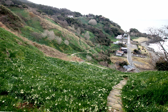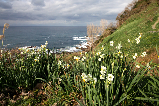 越前水仙について、下岬地区では次のような伝説が語られている。平安時代末期、居倉浦の山本五郎左衛門は長男の一朗太と源平合戦に参加した。留守を守っていた次男の二郎太は海岸で美しい娘を助けて親しくなるが、父の戦死の報と共に帰郷した一朗太もまた娘に心を奪われてしまう。争う兄弟に苦しんだ娘は、荒れ狂う海に身を投げた。翌年の春、海岸に美しい水仙が流れついたという。地中海原産の水仙が日本に伝わった時期は不明であるが、平安末期から鎌倉初期にかけての公卿である九条良経の色紙に見られることから、この頃には存在したと考えられる。また相国寺の『蔭凉軒日録』には文明十九年(1487年)二月十八日に越前国府の妙法寺から将軍家に水仙が献上されたと記述がある。 ![]() 海岸から標高約150メートルまでの斜面に広がる城有集落の水仙畑