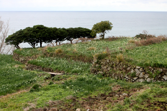 越前海岸において水仙の栽培が始まった時期は定かではないが、江戸時代後期に福井藩によって編纂された『松平文庫』のうち享保五年(1720年)の「越前国之内御預知産物」及び享保九年(1724年)の「越前国福井領産物」に越前国の産物として水仙が記されている。明治時代前期には下岬地区に6件ほどの販売問屋があり、福井まで約30キロメートルの山道を歩いて売りに出ていたと伝わっている。明治29年(1896年)に敦賀・福井間の鉄道が開通したことで交通の便が改善され、明治時代後期には数戸の農家が京都の生花市場へ出荷し、その後に町内の仲買人を通じて大阪や名古屋へも出荷したという。大正時代には傾斜地への球根の移植が進められ、この頃に本格的な栽培が始まったと考えられる。 ![]() 水仙畑に転用された石積みの棚田跡