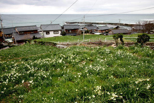 越前水仙について、下岬地区では次のような伝説が語られている。平安時代末期、居倉浦の山本五郎左衛門は長男の一朗太と源平合戦に参加した。留守を守っていた次男の二郎太は海岸で美しい娘を助けて親しくなるが、父の戦死の報と共に帰郷した一朗太もまた娘に心を奪われてしまう。争う兄弟に苦しんだ娘は、荒れ狂う海に身を投げた。翌年の春、海岸に美しい水仙が流れついたという。地中海原産の水仙が日本に伝わった時期は不明であるが、平安末期から鎌倉初期にかけての公卿である九条良経の色紙に見られることから、この頃には存在したと考えられる。また相国寺の『蔭凉軒日録』には文明十九年(1487年)二月十八日に越前国府の妙法寺から将軍家に水仙が献上されたと記述がある。 ![]() 海岸から標高約150メートルまでの斜面に広がる城有集落の水仙畑