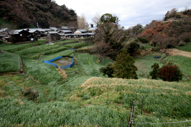 全国的にも珍しい水仙の棚田として「日本の棚田百選」に選ばれている 「左右」は海岸の入江に位置する半農半漁の村であり、刀祢(浦庄屋)を務めていた佐藤徳次郎家の文書によると、平安時代の延長元年(923年)までに佐保浦として成立していたとされる。また左右は各時代の荘園領主にワカメや塩を納めていた記録が残っており、現在も四月から六月にかけてワカメ漁が行われている。山間に位置する「梨子ヶ平」は稲作を主体とする農山村であり、源平合戦に敗れた平家の落人が七ツの平(梨子ヶ平、大平、小羽根ケ平、雪ケ平、竹ケ平、岩ケ平、坂ケ平)に分かれて隠れ住んだことに始まるという。しかし平坦な土地が少ないため、江戸時代には最も規模が大きな梨子ヶ平に集住し、米の自給自足を目指して千枚田と呼ばれる石積みの棚田を築き上げた。 ![]() 山間の谷間に家屋が密集する血ヶ平の集落