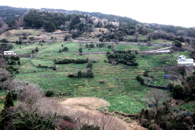 越前岬の中央部を占める上岬地区には、北から南に向かって「梨子ヶ平」「左右」「血ヶ平」「玉川」の四集落が開かれている。そのうち選定範囲に含まれているのは、現在も水仙の栽培が行われている「梨子ヶ平」「左右」「血ヶ平」の全域にあたる約603.4ヘクタールだ。海岸部は「潮吹岩」「呼鳥門」「鳥糞岩」などと呼ばれる奇岩や海食洞穴が数多く見られ、荒々しい岩礁が続く交通の難所であった。これら切り立った岩肌が豪壮な眺望を見せる上岬地区の海岸線は、越前海岸を代表する景勝地のひとつとしてその大部分が「越前加賀海岸国定公園」の特別保護地区に指定されている。また山中には滝が多く、白山信仰の祖である泰澄大師が修行をした場所のひとつでもある。 ![]() 現在は水仙畑として利用されている梨子ヶ平の千枚田